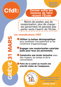 Le 31 mars, la CFDT Éducation appelle tous les personnels à se mobiliser pour dénoncer les suppressions d’emplois et leurs conséquences désastreuses sur le terrain. Nous exigeons un plan pluriannuel qui inclut des créations de postes et des revalorisations salariales, afin de redonner à l’École publique les moyens de ses ambitions.